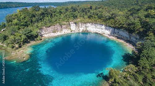 Aerial View of a Lush Tropical Island with a Vibrant Blue Hole Lagoon