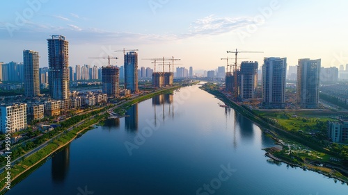 Aerial view of a modern city skyline along a river, showcasing tall buildings and construction cranes at sunrise.