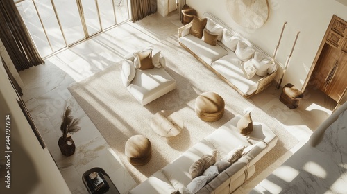 Aerial view of a modern living room with a light-filled space, cozy seating, and elegant design elements