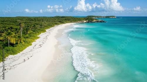 Aerial view of a pristine beach with turquoise waves meeting white sand, surrounded by lush greenery