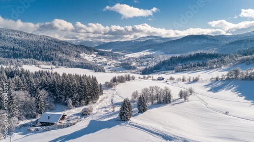 Aerial view of a snow-covered valley with pine forests