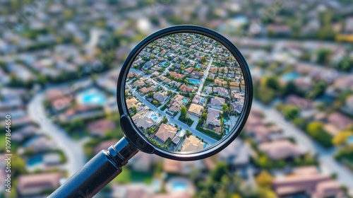 Aerial view of a suburban neighborhood magnified through a magnifying glass, revealing detailed houses and streets. The image symbolizes real estate analysis, property search, or urban planning.. AI