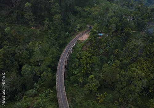 up high, aerial, countryside, curve, dense, drone, elevation, environment, forest, green, hill, infrastructure, landscape, lush, nature, outdoors, overlook, railroad, railway, rural, scenic, sri lanka, tour tourism, train track, transportation, travel, tree, tunnel, vegetation, view