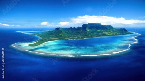 island, tropical, ocean, sea, blue, turquoise, water, landscape, nature, sky, cloud, coastline, shore, reef, mountain, green, lush, vegetation, idylli, paradise, vacation, travel, tour tourism, aerial view, remote, exotic, serene, calm, clearwater, horizon, vista, scenery