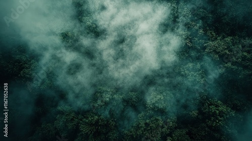 Aerial view of a tropical rainforest in Thailand with fog and clouds. high quality and a professional photograph. It is a top-down aerial shot with natural lighting, a perfect composition, color