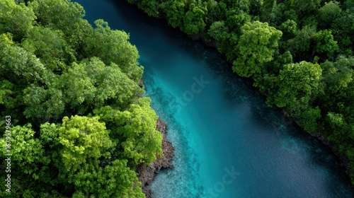 aerial, view, turquoise, lagoon, surrounded, lush, tropical, rainforest