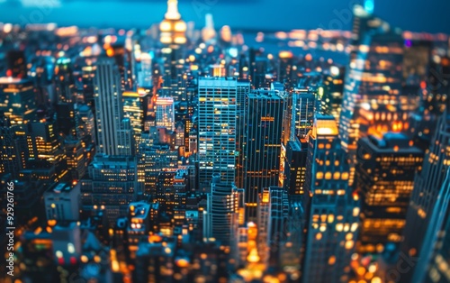 Aerial view of a vibrant cityscape at night with illuminated skyscrapers and streets, creating a bustling urban atmosphere. Perfect for city life and night-time themes.