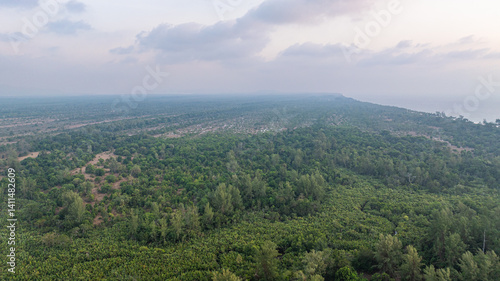 Aerial view of above Koh Phra Thong Phang Nga Thailand. The lush green forest has white sand beaches around the island and there are small islands. The pristine nature is perfect for relaxation.