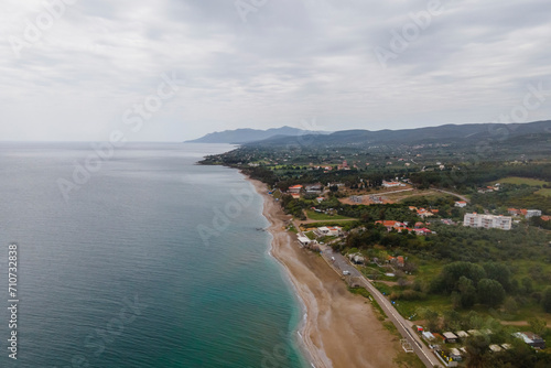 Aerial view of an empty beach along the Thracian Sea, Makri, East Macedonia and Thrace, Greece.
