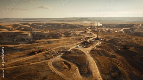 oil, field, desert, landscape, aerial, view, drilling, pump, machinery, equipment, industry, extraction, production, energy, resource, natural, sky, horizon, cloud, sun, light, brown, sand, hill, mountain, ground, earth, dirt, track, road, path, vehicle, pipe, wire, cable, sunset, dusk, evening, gold, hours