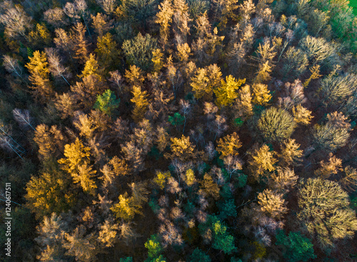 Aerial view of autumn colours in mixed forest Dennendijkse Bossen with golden leaves and tranquil foliage, Asten, Netherlands.