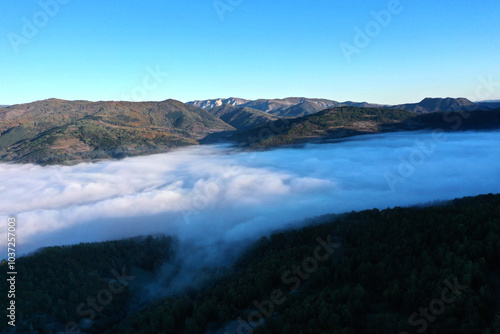 Aerial view of autumn morning mist and clouds in the valley