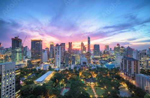 Aerial view of Bangkok modern office buildings, condominium in Bangkok city downtown with sunset sky , Bangkok , Thailand