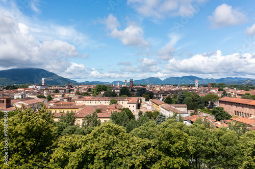 Aerial view of beautiful medieval old town with historic buildings and scenic rooftops, Lucca, Italy.