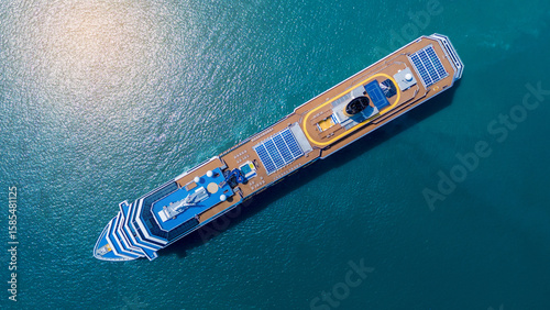 Aerial view of beautiful white cruise ship above luxury cruise in the ocean sea at early in the morning time concept smart tourism travel on holiday vacation time on summer, webinar banner
