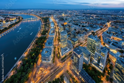 city, city landscape, aerial view, dusk, evening, night, river, building, skyscraper, urban, metropolis, light, illuminated, skyline, downtown, architecture, modern, twilight, city landscape, urban life, city lights, city view, city life, building, skyscraper, modern architecture, highrise, aerial photography, aerial photo