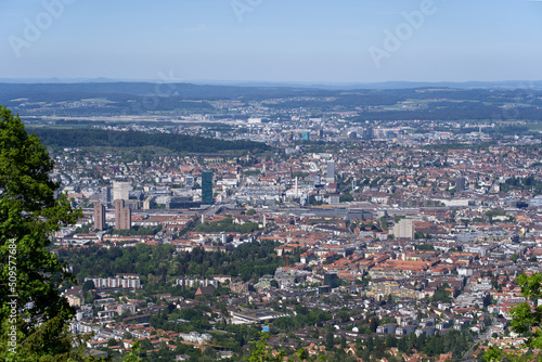 Aerial view of City of Zürich seen from local mountain Uetliberg on a sunny spring day. Photo taken May 18th, 2022, Zurich, Switzerland.