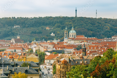 Aerial view of cityscape and St. Nicholas Church in Prague, Czec
