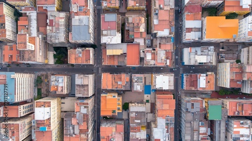 Aerial view of dense urban neighborhood with terracotta rooftops and narrow streets. Birds eye perspective of residential district in Latin American city. Urban planning concept