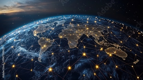 Aerial view of Earth showcasing interconnected global networks illuminated at night