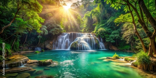 waterfall, jungle, serene, calmness, nature, photo, landscape, rainforest, lush, green, water, cascading, pool, copy space, inspiration, realistic, multilayer, mist, sunlight, leaf, rock, aerial view, birds eye view, natural beauty, travel, adventure, vacation, escape, peaceful, calm, relaxation, meditation, spiritual, vibrant, stunning, breathtaking, picturesque, exotic, wilderness, tropical, paradise