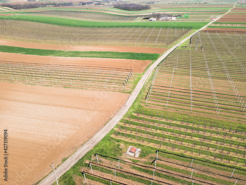 aerial, agriculture, fruit farm, spring, farmland, field, landscape, nature, farm, green, rural, countryside, land, summer, field, grass, farming, meadow, country, blue, crop, hill, harvest, agricultural, plant, cloud, drone