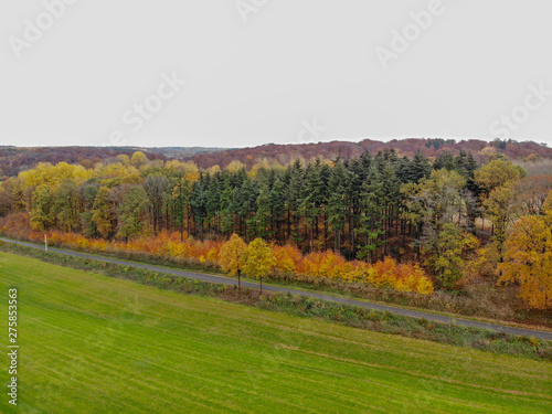 Aerial view of forest with small road during autumn season and colors in the countryside of Walloon Brabant. Belgium