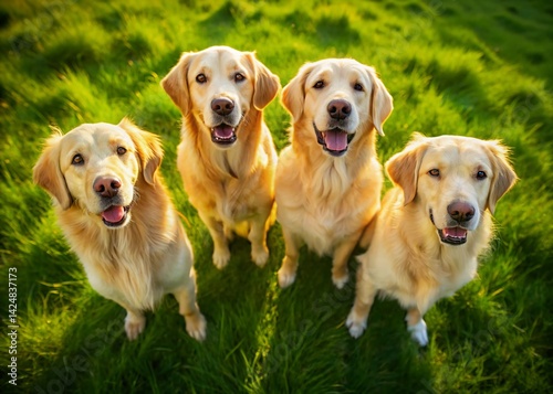 Aerial View of Four Golden Retrievers Standing in a Field