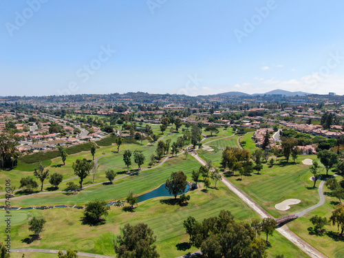 Aerial view of golf in upscale residential neighborhood, Rancho Bernardo, San Diego County, California. USA.