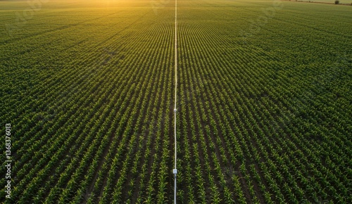 Aerial view of green cornfield with irrigation system at sunset showcasing agricultural beauty and rural life.