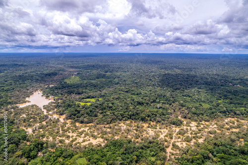 Aerial view of huge flooded forest in Amazon rainforest beautiful landscape in sunny summer day. Concept of conservation, environment, ecology, nature, climate, biodiversity. Amazonas, Brazil.