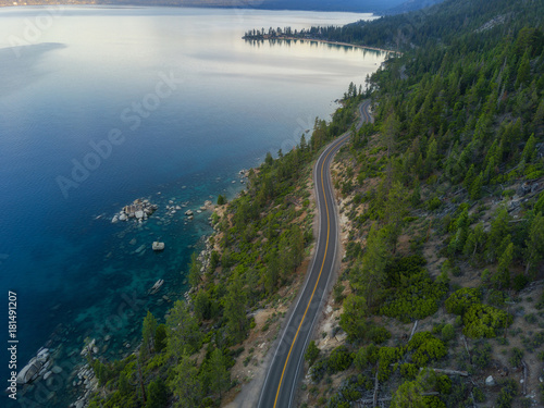 aerial view, drone, lake tahoe, nevada, california, shoreline, shore, coastline, road, travel, tree, tree, pine, nature, landscape, flying, up high, scenic