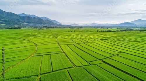 Aerial view of lush green rice fields with geometric patterns, surrounded by mountains under a cloudy sky.
