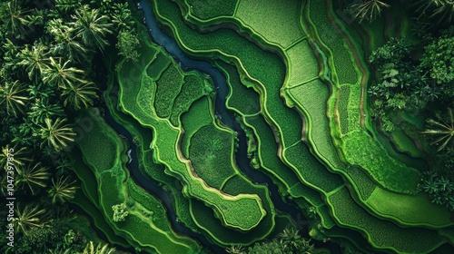 paddy field, paddy field, agriculture, rural, landscape, aerial view, tropical, greenery, green, nature, environment, palm tree, tree, foliage, plant, water, river, stream, farmland, cultivation, farming, countryside, asia, southeast asia, natural beauty, growth