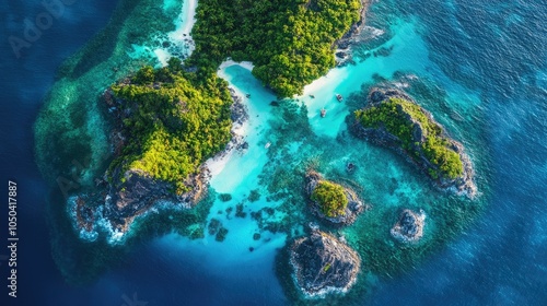 Aerial view of lush green tropical islands in the Mamanuca archipelago, surrounded by vibrant blue waters. No people included.
