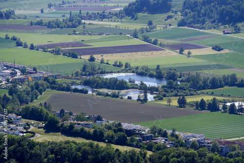 Aerial view of midland with agricultural fields, wood, ponds and hills seen from local mountain Uetliberg on a sunny spring day. Photo taken May 18th, 2022, Zurich, Switzerland.