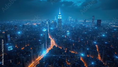 Aerial view of modern city at night with blue illumination. Cityscape displays glowing network connections, data streams, digital infrastructure. Futuristic urban visualization highlights