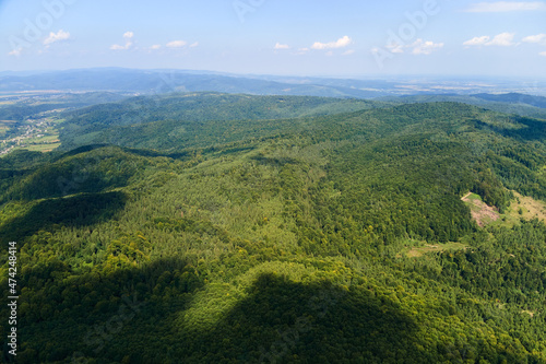 Aerial view of mountain hills covered with dense green lush woods on bright summer day