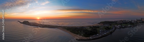 Aerial view of Nobbys Headland bathed in the warm glow of sunrise, contrasting with the cool blue ocean and the cityscape, Newcastle, NSW, Australia.