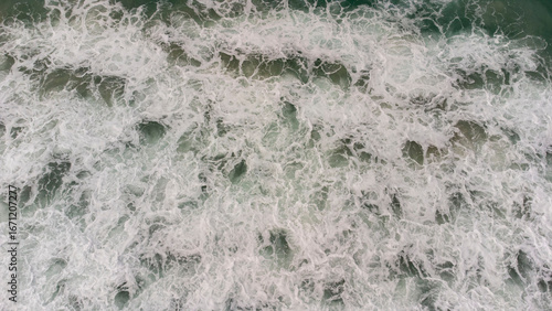 Aerial view of ocean waves crashing with white foam on green sea surface, creating natural texture and abstract pattern, perfect for backgrounds, nature concepts, and coastal design.
