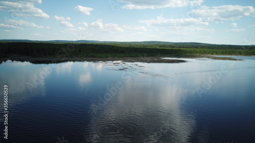 Aerial view of river Kama, Perm krai, Russia. Rural landscape from above, water waves, cloud reflection in water, trees on the coast, summer sun day. Copy space.
