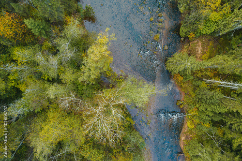 Aerial view of river surrounded by thick forest during foggy autumn morning.