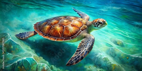 sea turtle, aerial view, ocean, turtle, painting, art, wildlife, nature, animal, marine life, sea, water, beach, coastal, artwork, canvas, sun, light, blue, green, vibrant, colourful, detailed, hi-res, photo, image, picture, illustration, artistic, creative, beautiful, serene, peaceful, summer, tropical, exotic, underwater, aquatic, reptile, conservation, endangered species, ocean life, marine animal, ocean life