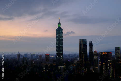 Aerial view of skyline of Taipei city with Taipei 101 Skyscraper at sunset from Xiangshan Elephant Mountain. Beautiful landscape and cityscape of Taipei downtown buildings and architecture in the city
