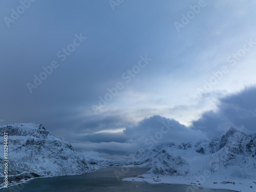 Aerial view of snow-clad mountains meet the tranquil waters under a moody sky, creating a serene yet powerful landscape, Nordland, Norway.