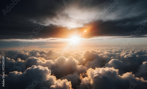 sun, cloud, sky, aerial view, sunlight, horizon, bright, dramatic sky, atmospheric, aethereal, peaceful, golden light, blue skies, dark clouds, contrast, layer, puffy clouds, serene, expansive, beautiful, natural, stunning, sunbeam, heavenly