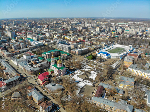 Aerial view of the church and stadium in spring (Kirov, Russia)