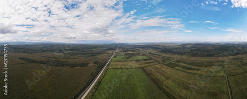 Aerial view of the country road and power lines near to the hill range, small coniferous forest and meadows agriculture at summer cloud sunny with horizon, panorama