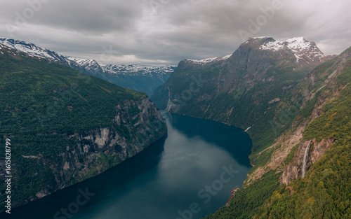 Aerial view of the Geirangerfjord's dark waters snaking between towering cliffs and verdant slopes, crowned with snow under a brooding sky, Stranda Municipality, Møre og Romsdal, Norway.