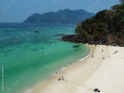 Aerial view of the Long Beach in Koh Phi Phi don and its quite coral sand, turquoise water and coral reefs with a limestone mountain in the background, scenic landscape in Krabi, Thailand